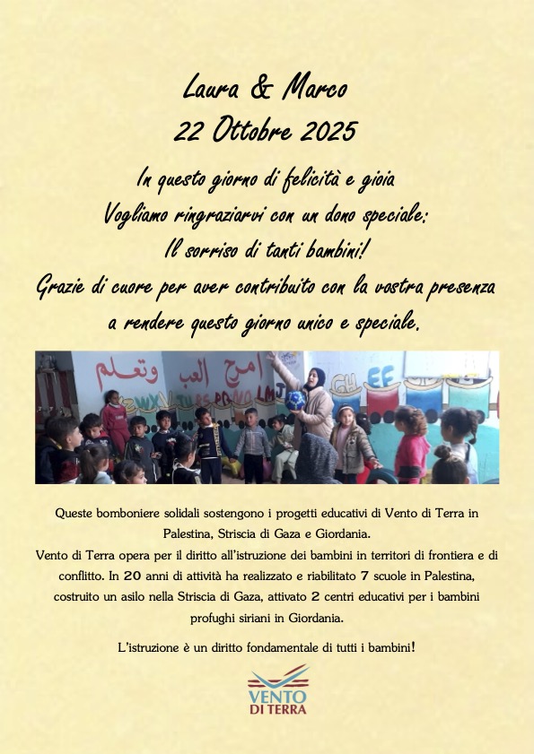Rendi questi momenti ancora più indimenticabili con le bomboniere solidali di Vento di Terra: le ciotole dipinte a mano dagli artigiani di Hebron, i sacchettini porta confetti, oppure fai una donazione con le pergamene solidali, personalizzabili con la tua frase e con il progetto da te scelto.